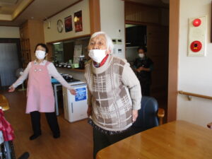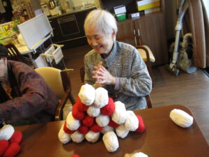 今日もみなさん、健康のために体を動かしましたね。体操、そしてお手玉積みは