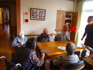団扇で仰いで風船バレーをしました