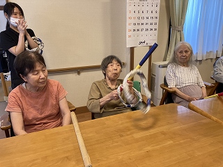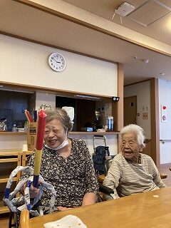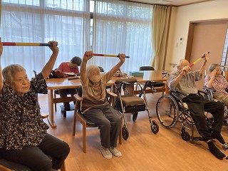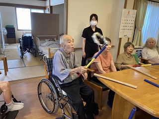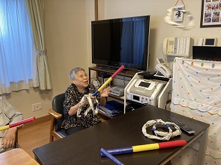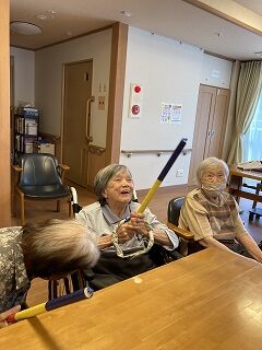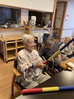 今日のレクレーション、棒体操と輪投げの様子です。沢山の笑顔が見られました。