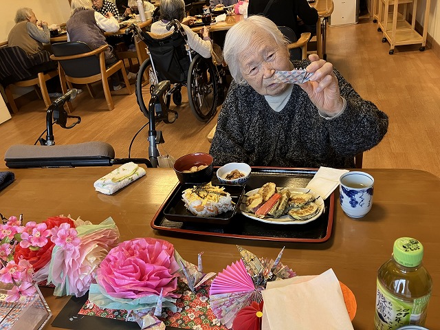 今晩は、本日は雛祭りです😊昼食に天ぷら、ちらし寿司を召し上がられました。レクレーションも楽しまれました。