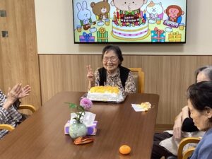 誕生日にみなさんでケーキを作り、お祝いをしました。