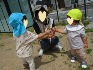 保育者の手の平にのっているカエルをジーッと見ていました🐸