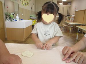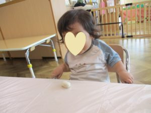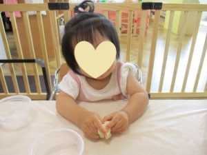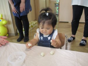 感触を感じながら、コネコネしたり、指先でギューっと押したり、カップに入れたり(*^-^*)