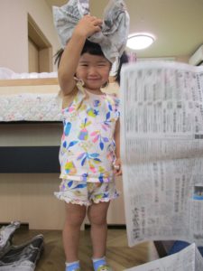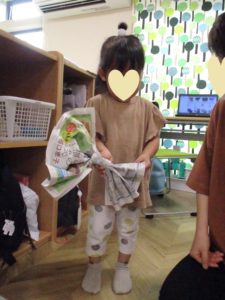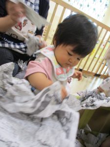 新聞紙をビリビリ破ったり、丸めたり、保育者にリボンなどの飾りを作ってもらったりと楽しそうでした🎀