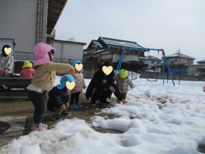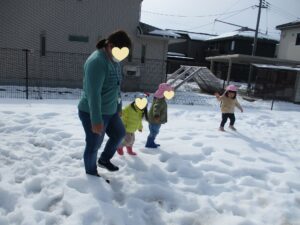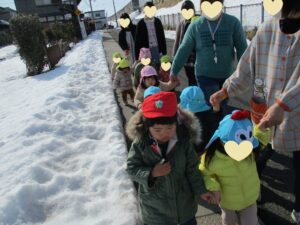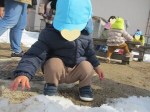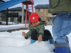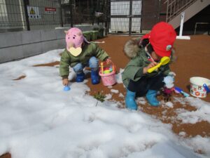今日からりす組さんに新しいお友だちが増えました💗 園周辺を散歩し、近くの公園で雪を掴んだり、投げたりして楽しみました🎵 うさぎ組さんは園庭でもスコップやバケツを使って遊びました⛄