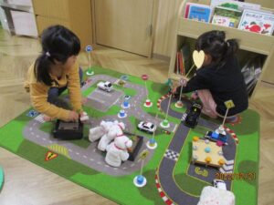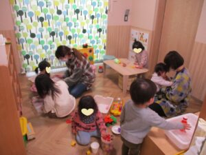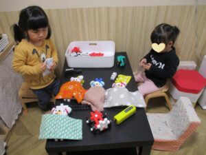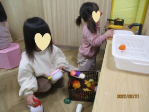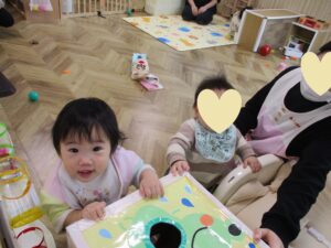 降っている雪を室内から眺めながら、好きな遊びを楽しみました⛄ 2歳児うさぎ組さんは、ソフトブロックや人形遊び、ロードマップあそびで大盛り上がり🎵 1歳児りす組さんは、0歳児ひよこ組さんの高月齢のお友達と一緒に、ままごとやブロックをして過ごしました😊 0歳児ひよこ組さんの低月齢児のお友達は、伝い歩きやハイハイ、よちよち歩きで身体を動かしたり、好きな玩具で遊びました🎵 各クラス、のびのびと時間を満喫しています💗