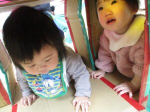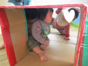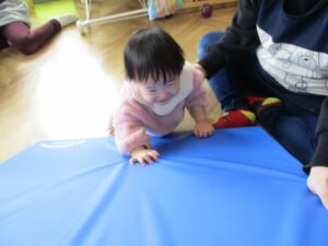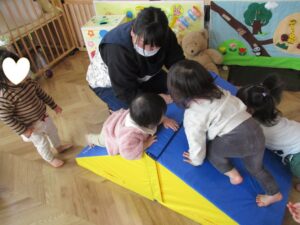 保育室で運動遊びを楽しむと、マットのお山を一生懸命に登りおりしたり、トンネルでバァ💗