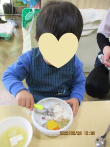 2月最後の今日は、お楽しみ給食でした。たっぷりお散歩した後は、おなかもペコペコ。大好きなふりかけごはん🍚や、玉子焼きにみんなニコニコ😊でした。