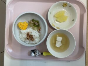 今日の献立は、かつおのふりかけごはん🍚、ハート💗のコーン玉子焼き、大根と鶏肉のとろみ煮、じゃがいもと豆腐のみそ汁、パイナップル🍍缶でした。