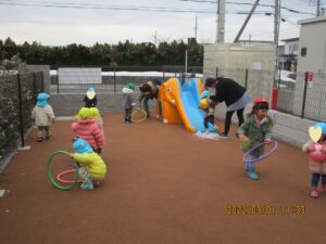 今日は少し園周辺を散歩した後、園庭で遊びました😊ボールを投げたり、フラフープを繋げてジャンプ✨