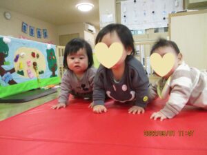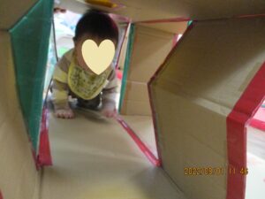 小さいお友だちは、マットの上で先生とハイハイ競争🎵トンネルの中もとっても早く通り抜けちゃいます😲