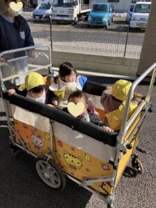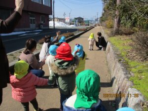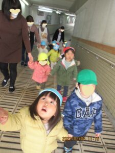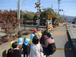 暖かい春の日差しの今日、高月ひよっこ保育園の1歳児りす組さんと2歳児うさぎ組さんは、電車を見に、高月駅まで散歩に出かけました。