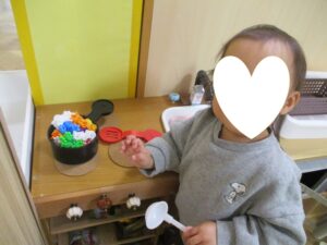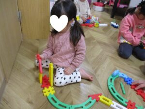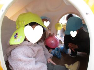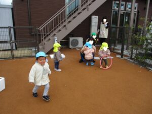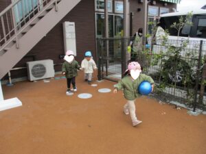 室内でままごとやブロック遊びを楽しんだ後は、ボールとフラフープを持って園庭へ出発🎵❕❕