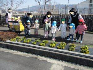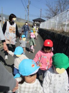お友だちや保育者と手を繋いで上手に歩きました。途中できれいなお花を見つけて大喜び‼