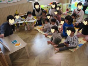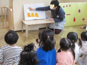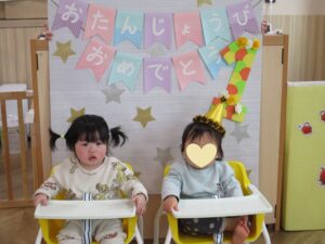 3月生まれのお友だちが沢山います🍰 今日は、0歳児ひよこ組、1歳のお誕生会を行いました💗ハッピーバースディのお歌をみんなで歌い、お祝いしました🎉 先生からのお楽しみは、たまごのパネルシアター🥚ひと通り見てから、もう一回!!とリクエスト😊「たーまごたまごがパチンとわれて~🎵」と歌い楽しみました💕