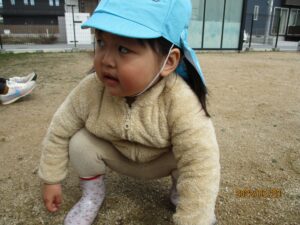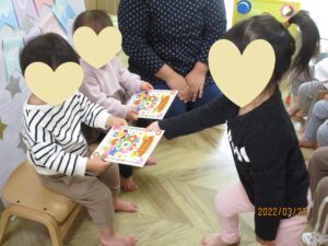 ハッピーバースデー🎵の歌を歌った後は、2歳児うさぎ組さんのお姉ちゃんから、お誕生日のプレゼントを貰ってニコニコ😊でした。