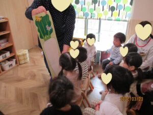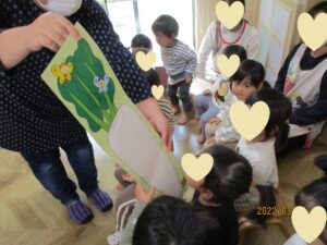 先生からのお楽しみは、『おおきな大根』のお話でした。みんな食い入るように、真剣な顔でお話を聞いていました。大根をパクパク食べる真似をして、お誕生会を、みんなで楽しく過ごしました。