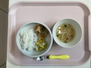 今日の献立は、炊き立てごはん、鶏肉と野菜のごま味噌炒め、白菜とコーン🌽のサラダ、そうめんのすまし汁でした。ごはんもおかずもしっかりおかわりして、たくさん食べられました🎵