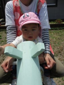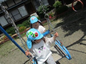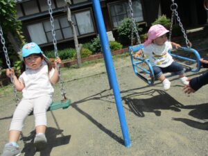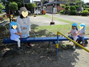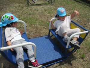 お友だちと一緒にシーソーに乗ってギーコー🎵ギーコー🎵 ゆりかごに乗ってユーラユラ🎵