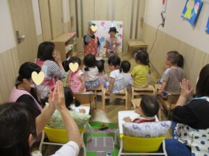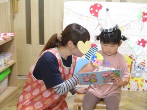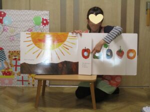 その後はお楽しみの時間で、「はらぺこあおむし」の大型絵本にくぎ付けの子どもたち。