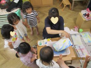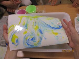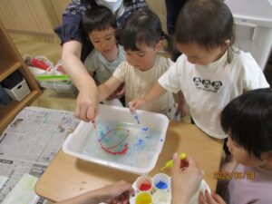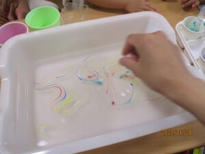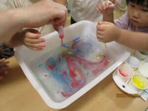 みんなで絵の具を垂らして混ぜてみると水面で様々な模様に大変身🌟!!!!! 初めての体験にみんな興味津々です👀✨✨ さぁ~て、何ができあがるのかな😁❔