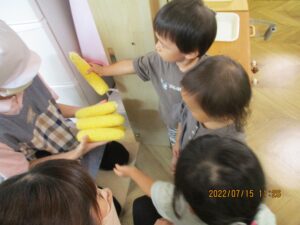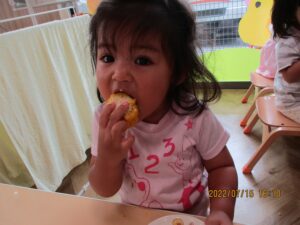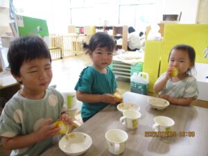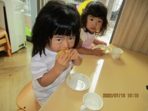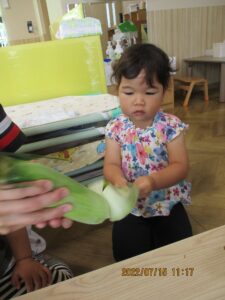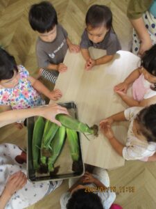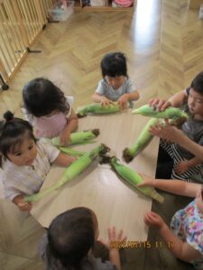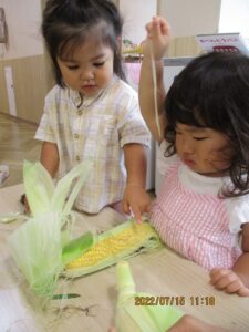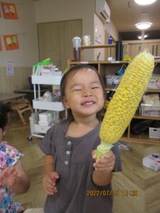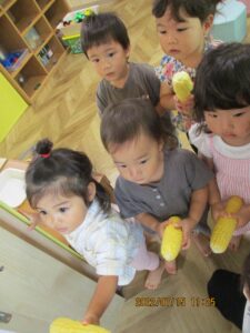 今日は、トウモロコシの皮むきをしました🌽最初は、触るのを嫌がる子もいましたが、みんな頑張って皮をむきむき。 きれいになったトウモロコシを持って「できたー!!」とニッコリ笑顔😊✨ おやつに茹でてもらい、がぶっと大きな口でおいしく頂きました💗