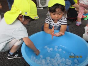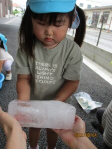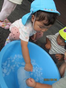 氷遊びでは、「冷た~い‼」と言いながらも手を伸ばす子ども達👐✨ 触っていると体温で少しずつ溶けて、氷水になる事に興味津々😊💦