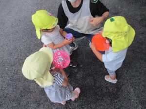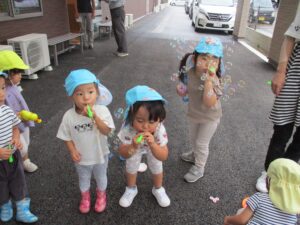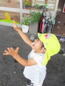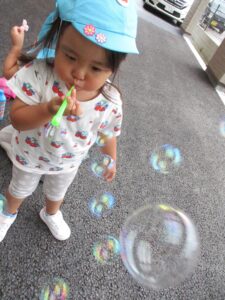 程よい優しい風で、シャボン玉がフワフワ~✨追いかけて遊ぶ子や、パチンと手でたたいて割る子、飛んでいくのを「きゃあきゃあ💕」言いながら見る子など、それぞれの楽しみ方がありました🥰