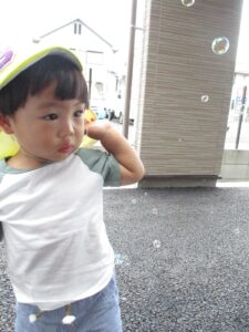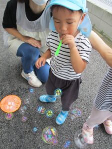 2歳児うさぎ組さんは、自分で吹くことに挑戦!!最初は手こずっていましたが、だんだんと上手くできるようになり、夢中でシャボン玉を飛ばしていました😊🎵