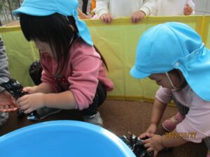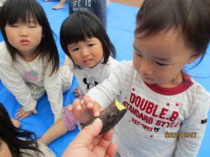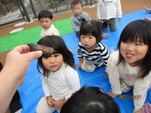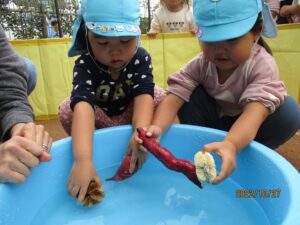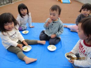 お昼寝から起きると、良い匂いがしてきて園庭へ・・・