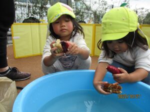 今日は焼き芋クッキング🍠 たわしでさつま芋を洗って、