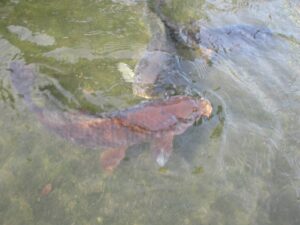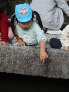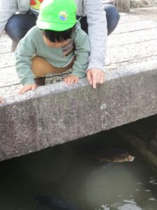 鯉に餌をあげると、たくさん集まってきて、皆は指をさして「いたいた~」「お~‼」と、嬉しそうに見ていました🐟✨✨