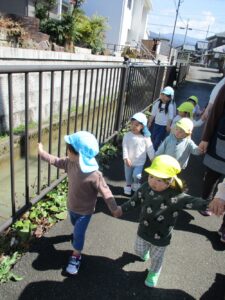 うさぎ組のお友だちにりす組の子と手を繋いでもらい、お散歩に行きました👣