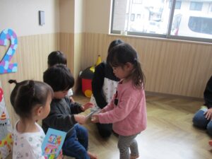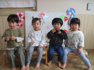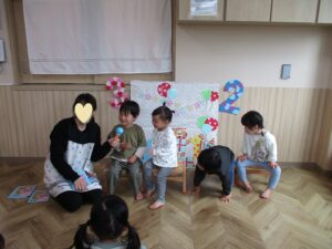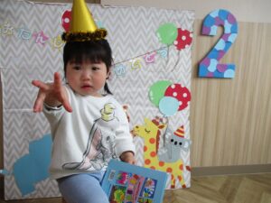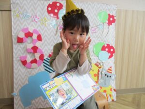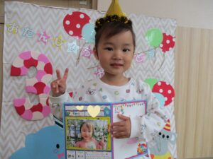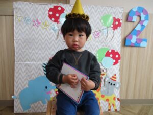 みんなの前に出ると、ちょっぴり恥ずかしく、緊張したお顔をしていましたが、皆にお祝いされて、だんだん笑顔も見られ(*^^*)、「お名前は?」「好きな遊びは何ですか?」などの質問にも、上手に答えてくれました🤗💕
