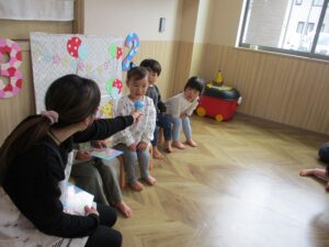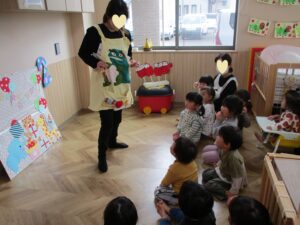 先生からのお楽しみは、『だるまさんの』のペープサートと、『食いしん坊怪獣』のエプロンシアターでした✨