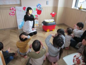 大きな怪獣が怖い子もいましたが、「何食べようかな~?」の声に、「ケーキ!」「アップル~🍎」などなど、食べて欲しい食べ物を口々に答えていました😝