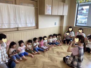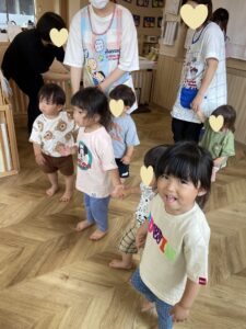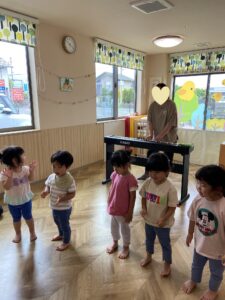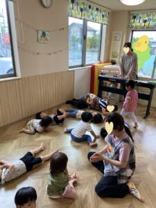 ピアノの音🎶に合わせて、カエル🐸に変身したり、カタツムリ🐌に変身したり、寝転がったりとたくさん身体を動かして、笑顔いっぱいの子ども達🥰
