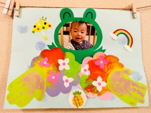 0歳児は、手型で葉っぱをつくり、フィンガーペイントで紫陽花を表現しました🥰