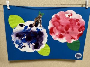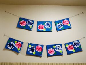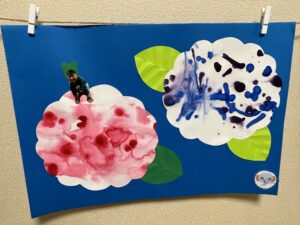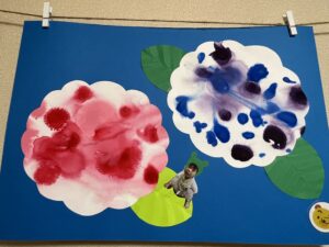 2歳児は、濡らした画用紙に綿棒で絵の具を垂らし、にじみ絵で紫陽花を作りました😊