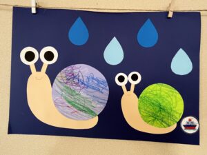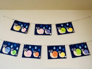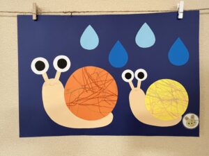 1歳児は、画用紙にクレヨンでなぐり描きをして、カタツムリの殻にしてみました🐌