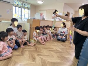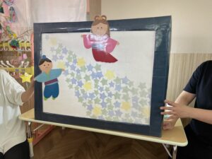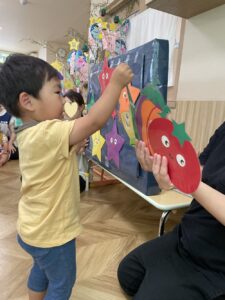 先生のお楽しみで、お腹をすかせたお星さまが夏野菜を食べ、元気な色になるパネルシアターを見ました👀