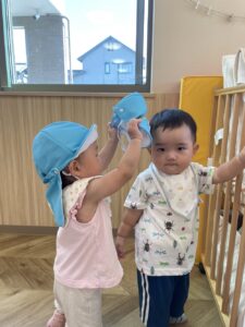 散歩の準備中にはお友だちに帽子を渡しに行ったり、準備ができたら上手✨と手を叩いて褒め合う可愛らしい姿が見られています💕