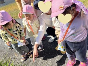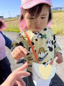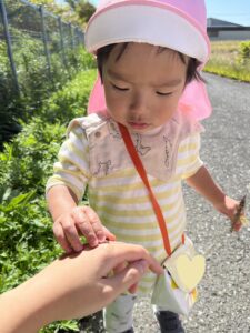 田んぼ道を歩いていると、たくさんのバッタやてんとう虫🐞をみつけ、大興奮の子ども達🤭歩く姿を眺めたり、指先で触ってみようとする姿がありました💖