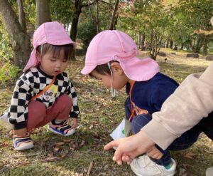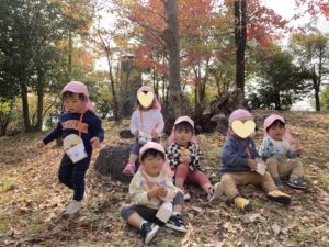 0,1歳児秋の遠足🍁🍙👜 今日は高月図書館広場まで遊びに行きました🌼 0歳児さんは、落ち葉を集めシャワーをしたり、感触を楽しんだりとポカポカとした気持ちの良い天気の中ゆったりと過ごしました😊🌞 公園内ではカエルがたくさん見られ、興味津々で観察する子どもたちでした👀