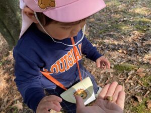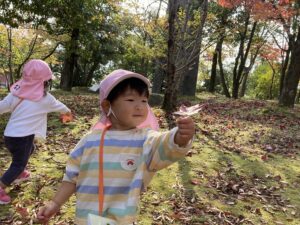 1歳児さんは、お散歩バッグをもっていき、どんぐりや色鮮やかな葉っぱを集めました🍁広々とした場所で、友だちと走り回って、元気いっぱいに過ごしました🥰