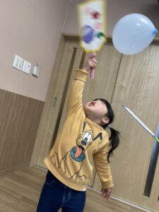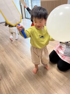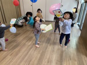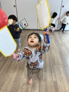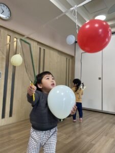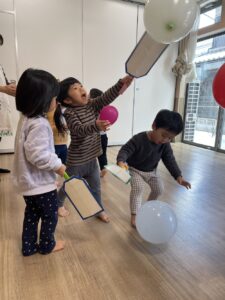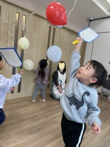 吊るした風船をついたり、個別に風船を羽子板ではねたり、、「え~い!!」とにぎやかな声が響きました😆🎵