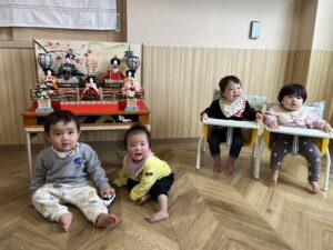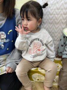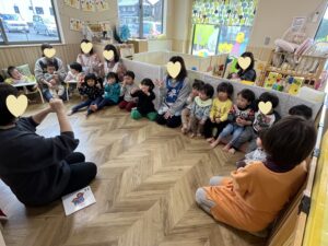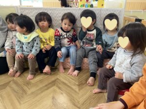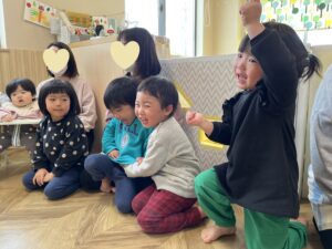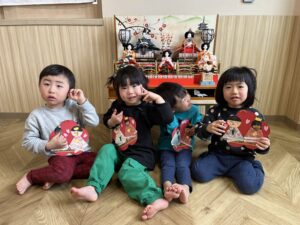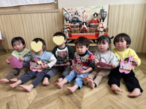初めに、一人ずつひな祭りの作品を紹介してもらい😆✨自分の番が来ると「これ私~!」と指さしたり🤭お友だちの作品にも「○○くんのだ!かわいい~💗」と大はしゃぎの子ども達✨