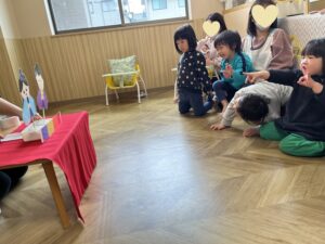 発表会の後は、ペープサートを楽しみ👀どこかに行ってしまったお雛様を「おひなさまー、でておいでー」と呼んで探してみると、お猿に、お相撲、鬼など色んなお雛様が登場し「あれ~なんか違~う!」と大笑いでした🤣