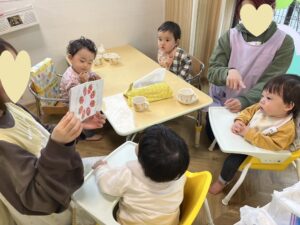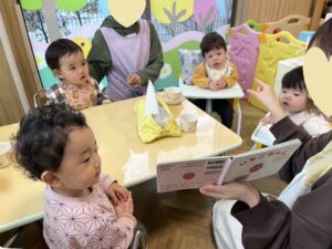 イチゴを食べる真似をしたり、「わあ!」と拍手をしたり楽しんで絵本を見る子どもたちでした🥰