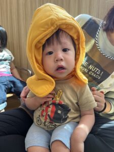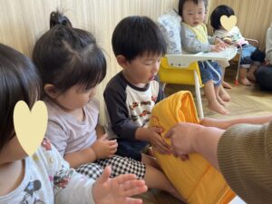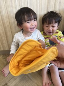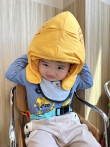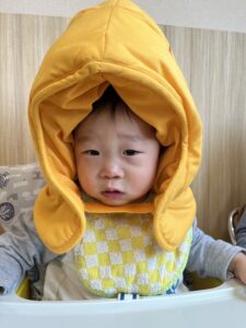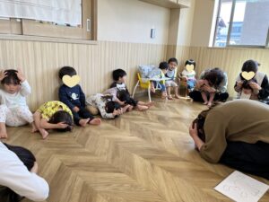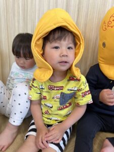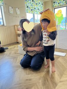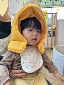 最後は保育者と一緒に防災頭巾を被る練習を行いました✨